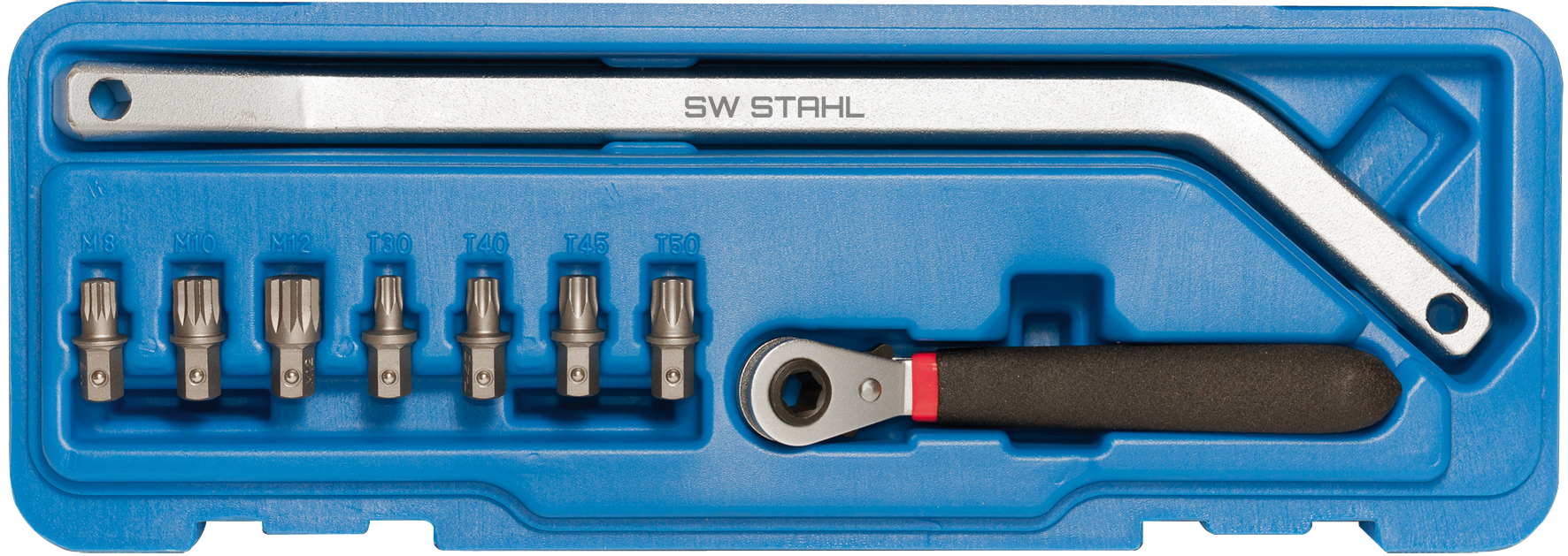 Abgewinkelte Ratsche und 2-fach abgewinkelter Montagehebel mit 8 mm Sechskant Bit- Aufnahme.